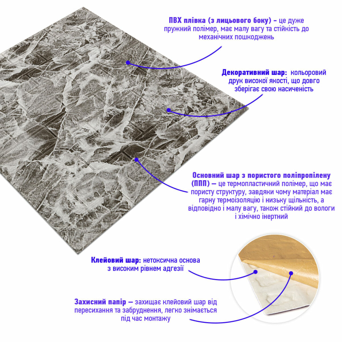Декоративная панель под черный мрамор изготовлена из вспененного полипропилена. Это универсальный и плотный материал, но в то же время легкий. Его срок службы более 20 лет. Самоклеющиеся 3D панели из полипропилена — это быстрый ремонт с минимумом шума и строительного мусора.