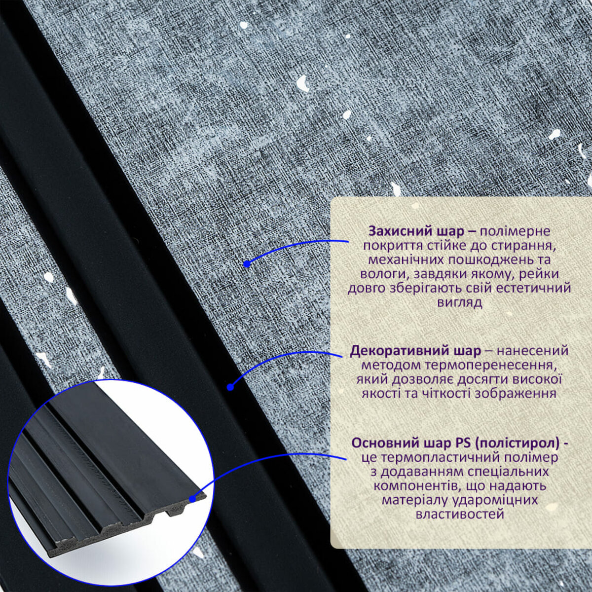 1. Защитный слой – полимерное покрытие устойчивое к истиранию, механическим повреждениям и влаге, благодаря ему, рейки долго сохраняют свой эстетический вид.