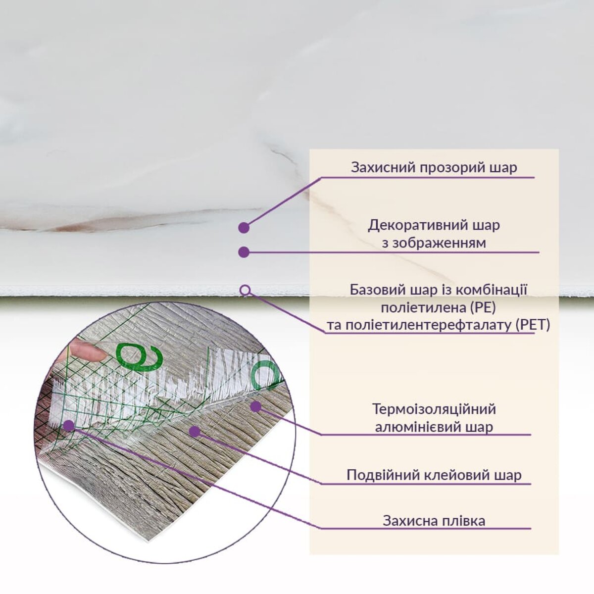 • Базовый слой из комбинации полиэтилена (PE) и полиэтилентерефталата (PET)
