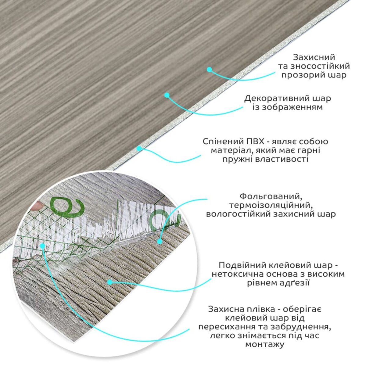 • Декоративный слой: пленка с цветной печатью высокого разрешения, которая полностью имитирует фактуру природных материалов благодаря четкому и детализированному изображению.