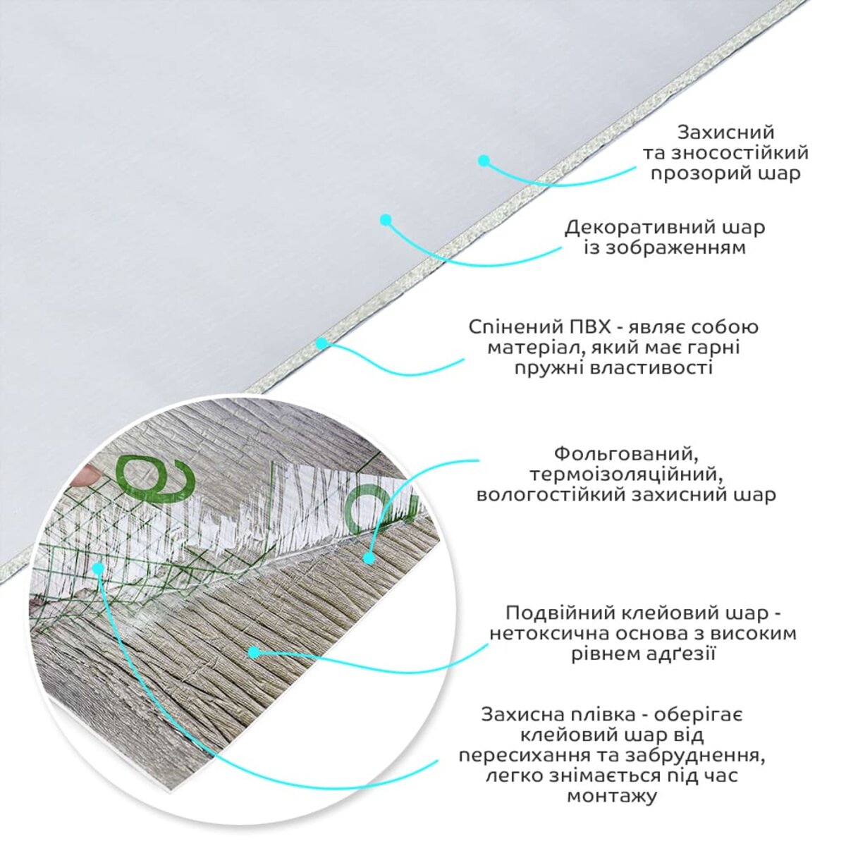 • Декоративный слой: пленка с цветной печатью высокого разрешения, которая полностью имитирует фактуру природных материалов благодаря четкому и детализированному изображению.