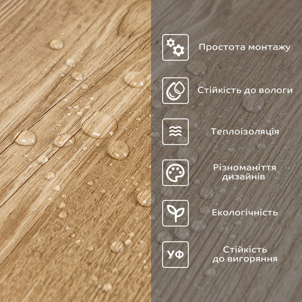 • Полимерный слой, защищает от потертостей и мелких механических повреждений, обеспечивает долговечность использования, а УФ защита помогает предотвратить выгорание, сохраняя цвет насыщенным, за счет чего плитка долго имеет свой первоначальный эстетический вид.