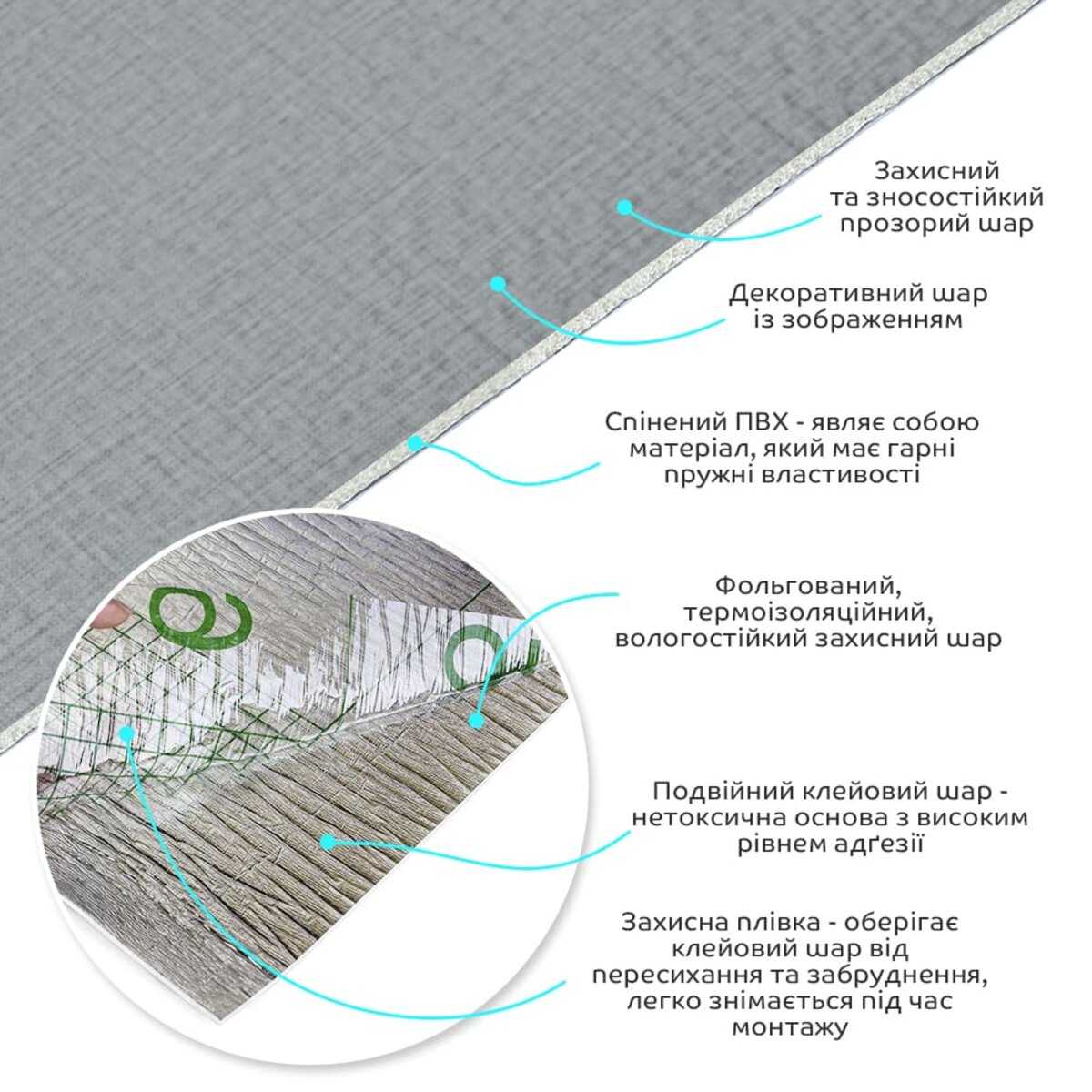 • Декоративный слой: пленка с цветной печатью высокого разрешения, которая полностью имитирует фактуру природных материалов благодаря четкому и детализированному изображению.
