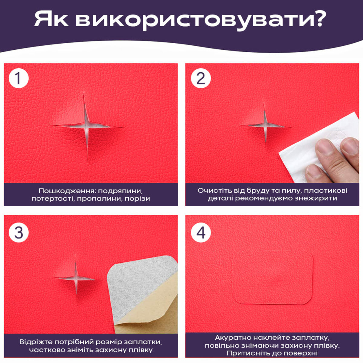 - Материал представлен полосами длиной 1 и 3 м, что позволяет увеличить вариативность размера площади использования: от маленьких, фигурных заплаток до устранения повреждений больших кожаных поверхностей;