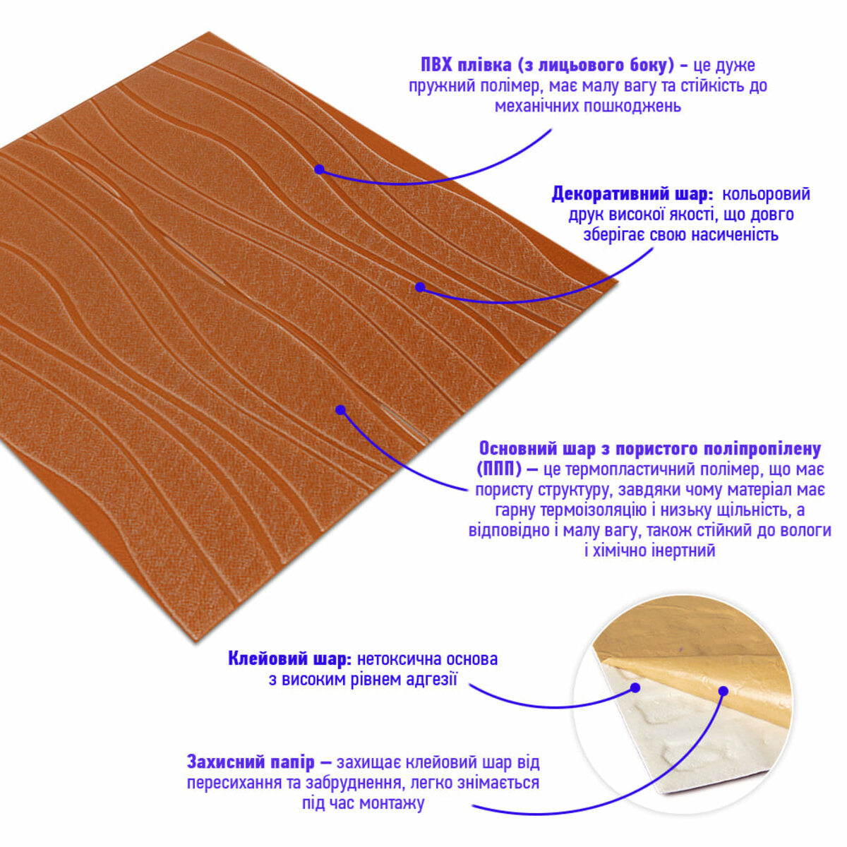 Материал панелей — вспененный полипропилен. Это полностью безопасный и нетоксичный материал, который имеет свойства шумопоглощения и утепления. А широкий выбор рисунков позволит сделать ваш интерьер уникальным и неповторимым.
